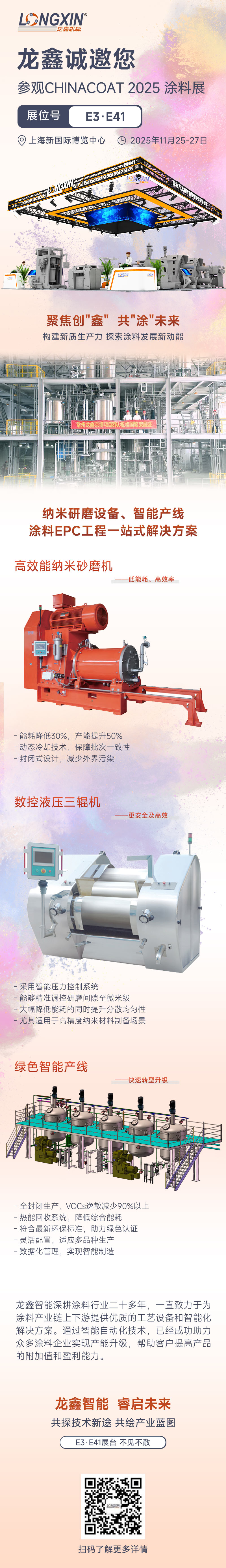 Chinacoat 2025 国际涂料展即将重磅启幕,作为涂料智能装备领域的创新企业,龙鑫智能携二十余年行业深耕积淀,以聚焦创"鑫" · 共"涂"未来为主题,亮相E3.E41展位,诚邀涂料、油漆、油墨、胶粘剂、密封剂及涂料原材料行业的新老客户齐聚上海,共探智能生产新技术、共话行业发展新动能,在变革浪潮中携手突围、共赢未来!