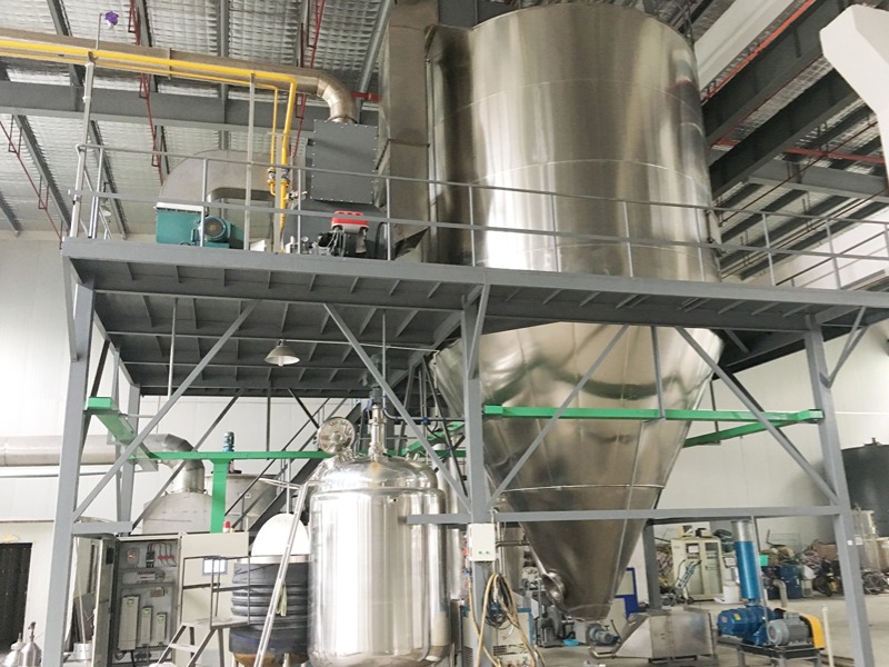 (3)喷雾干燥机生产过程简化,操作控制方便。对于湿含量40~60%(特殊物料可达90%)的液体能一次干燥成粉粒产品,干燥后不需粉碎和筛选,减少生产工序,提高产品纯度,操作环境卫生条件优越,能避免干燥过程中的粉尘飞扬。