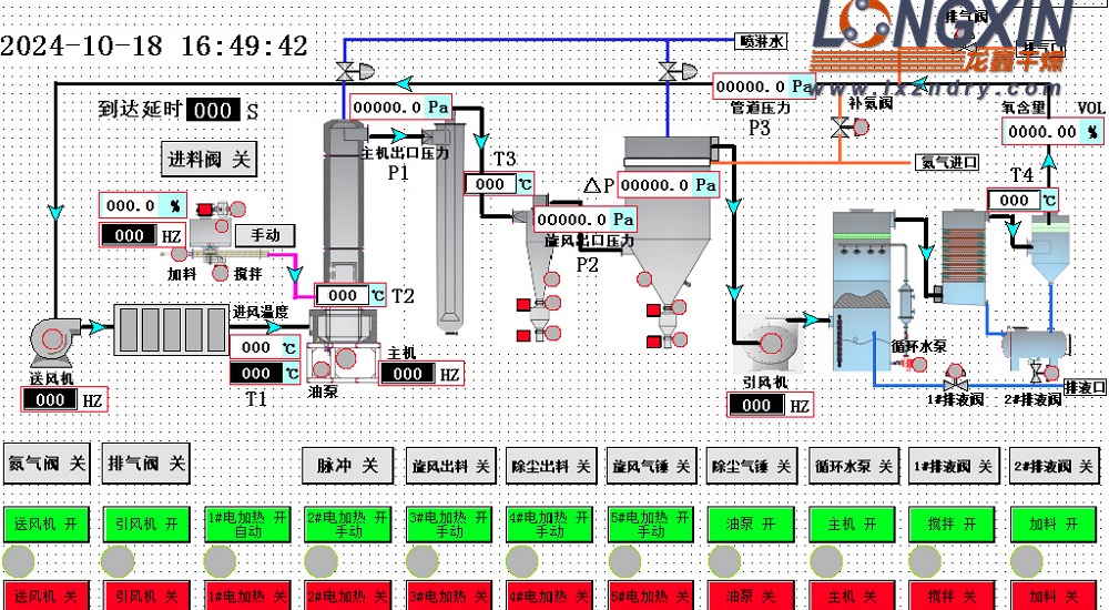 (7) 设备控制系统采用人机界面,即PLC+触摸屏控制,工艺流程图动态显示。产品的粒度、松密度、水分在一定范围内,可用改变操作条件进行调整,控制比较方便。