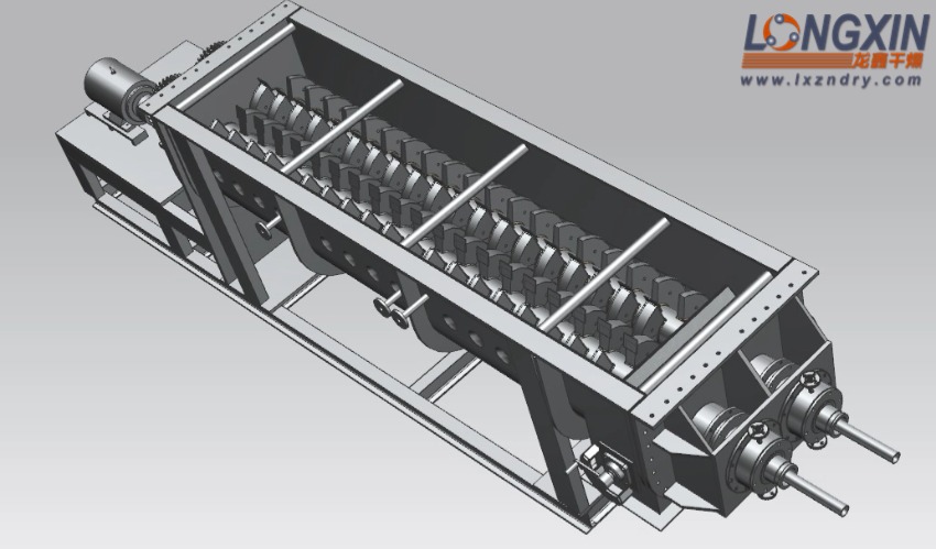 (2) 设备结构紧凑,装置占地面积小。干化所需热量主要是由密集地排列在空心轴上的许多空心桨叶壁面提供,而夹套壁面的传热量只占少部分。所以单位体积设备的传热面大,可节省设备占地面积,减少基建投资;