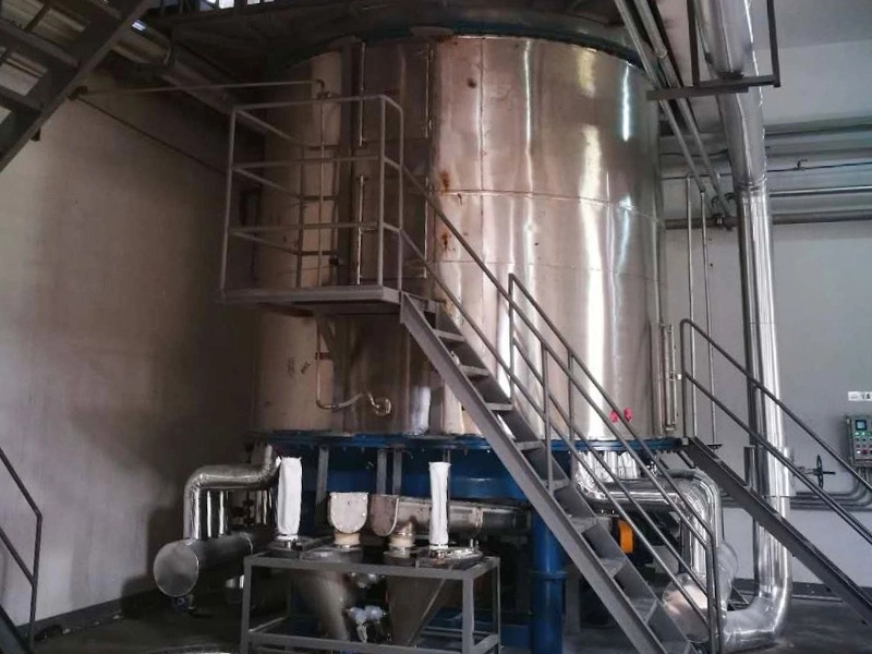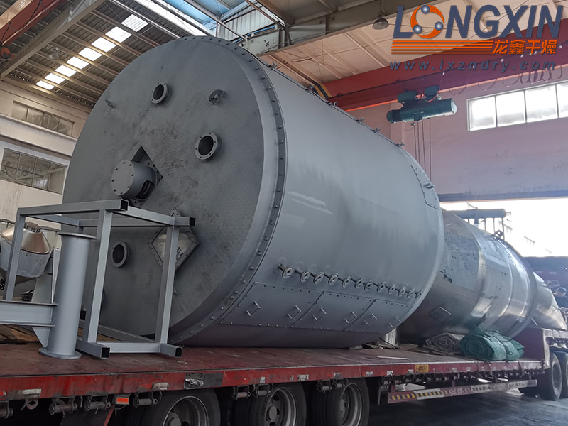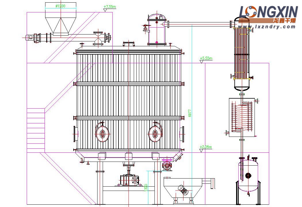 (3) 立式安装,保温完善,热源和废热利用率高。 蒸发每公斤水仅需1.1~1.4 kg蒸气。此外所需动力仅为回转圆筒干燥机的1/10左右,经济可行;